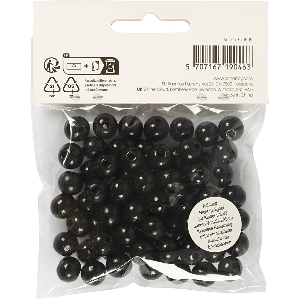 Træperler, diam. 10 mm, hulstr. 3 mm, ca. 70 stk., sort, 20 g/ 1 pk.