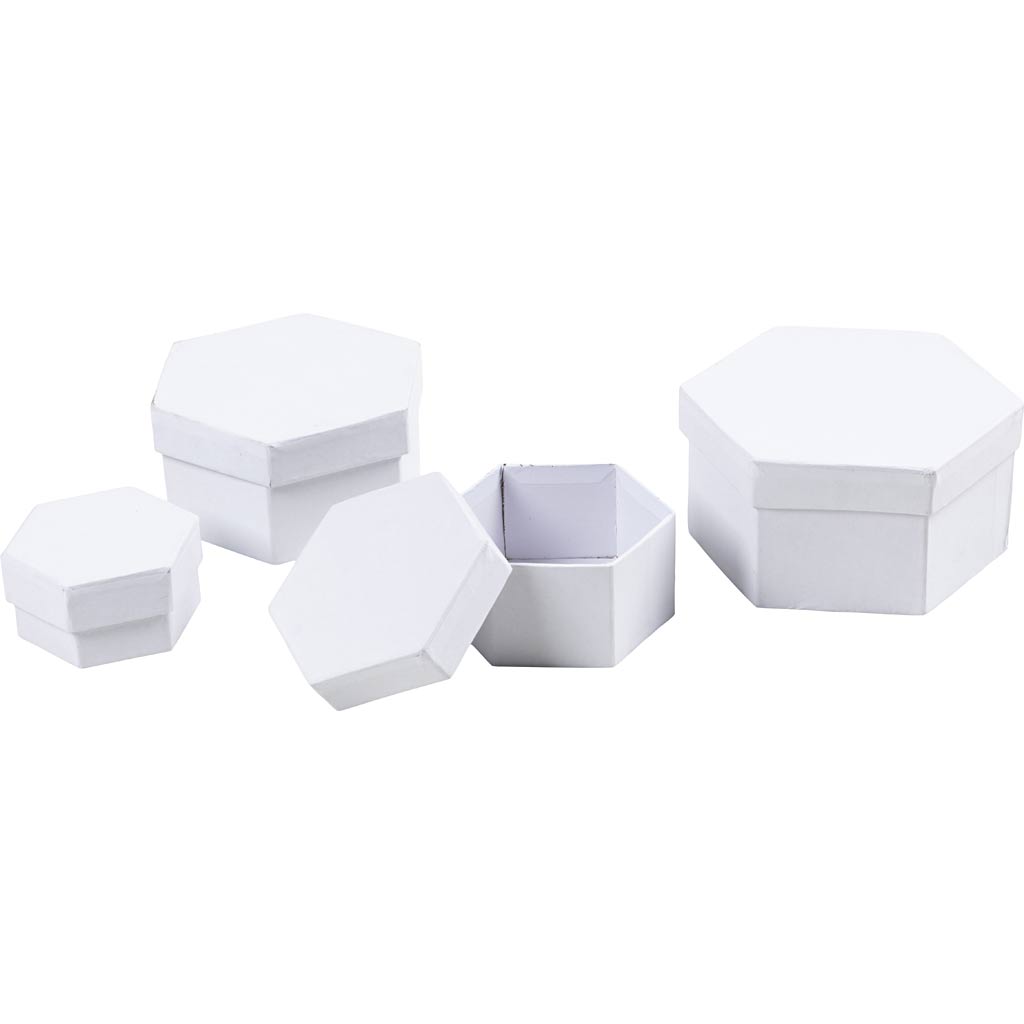 Sekskantede Æsker, H: 4+5+6+7 cm, diam. 6,5+8+10+12 cm, hvid, 4 stk./ 1 sæt