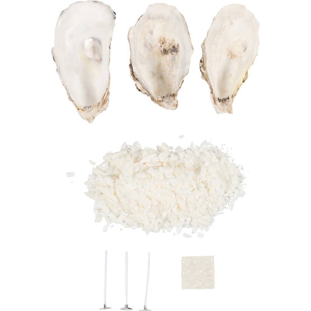 Med dette kit kan du støbe naturlige soyalys i smukke østersskaller. Indeholder alle de materialer du skal bruge, og al den vejledning du behøver